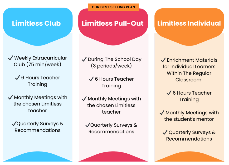 It’s a complete, research-rooted solution that schools can implement in the format that fits their timetable, staffing, and student needs – whether as our Limitless Club: a 90-minute weekly After-School Club, Limitless Pull-Out: a 3-period-per-week programme during the school day, or Limitless Individual: Enrichment resources to add extra challenge in the regular classroom.